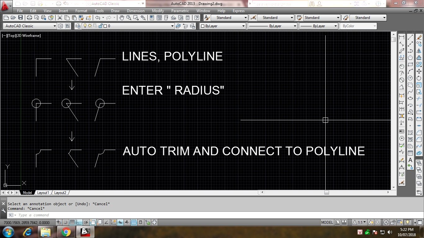 Dùng lệnh FILLET rồi mirror lại là xong. Trường hợp là Pline thì EXPLODE ra rôùi mirror.